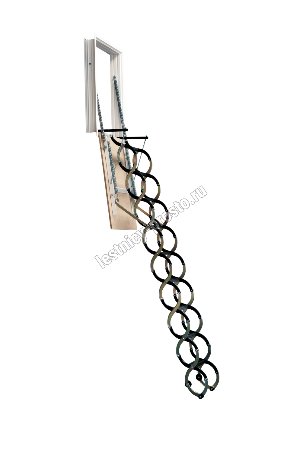 Лестница монтируется в стену. Лестница чердачная раздвижная ножничного типа, работает по принципу сжатия. Термоизоляционная крышка толщиной 16мм, НЕ УТЕПЛЕНА , облицована с двух сторон ДСП древесного цвета. Лестница предназначена для условий, когда чердак утеплен и не требует дополнительной теплоизоляции. Короб металлический высотой 140мм. по периметру проходит уплотнитель.