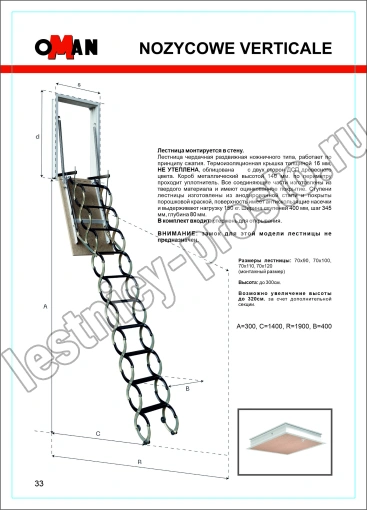 Чердачная лестница с люком OMAN NOZYCOWE VERTICALE 70х90 см, h-300 см
