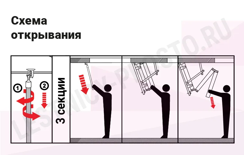 Лестница складная трёхсекционная, изготовлена из сосны. Термоизоляционная крышка типа "сэндвич" утеплена пенопластом, облицована с двух сторон ДСП белого цвета. Короб люка с однослойным уплотнителем. Все металлические элементы лестницы покрыты порошковой краской, ступени лестницы имеют антискользящие насечки и закреплены в столярное соединение «ласточкин хвост», что позволяет выдерживать нагрузку до 150 кг. Деревянный стержень для открывания лестницы в комплекте.