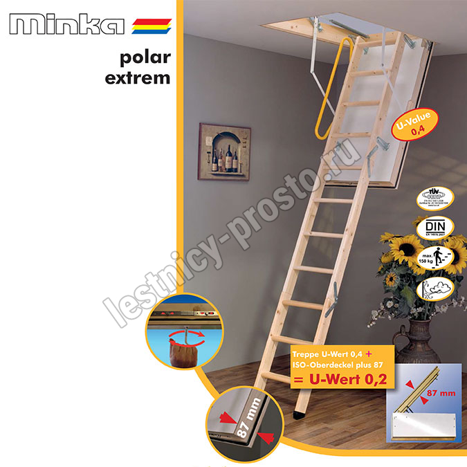 Polar Extrem – надежная и крепкая лестница, имеет высококачественные соединительные крепежи, компактную конструкцию. Оцинковки горячим способом всех металлических частей и последующая их обработка специальным защитным порошковым покрытием исключает коррозию.