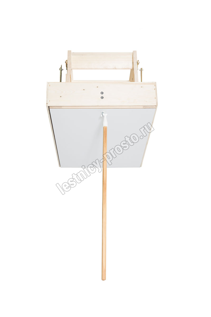 На ступенях лестницы антискользящие насечки. Люк с двух сторон облицован ДСП белого цвета. Размер короба: 900 × 576 мм