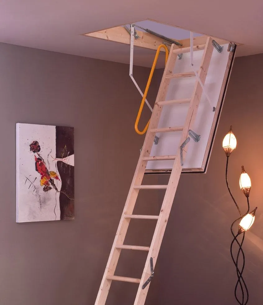Складная 4-х секционная чердачная лестница. Рабочая поверхность полностью выполнена из алюминия. Термоизоляционная крышка типа "сэндвич" имеет усиленную теплозащиту, облицована с двух сторон ДВП белого цвета. По контуру короба имеется уплотнитель; Все металлические элементы лестницы покрыты порошковой краской.