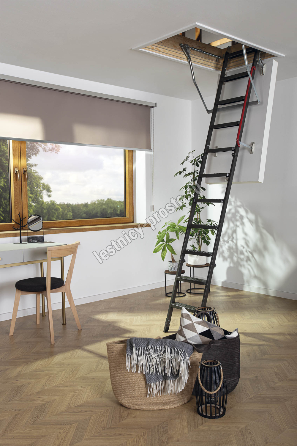 Лестница представляет собой складную конструкцию из металлического лестничного марша и термоизоляционного люка.