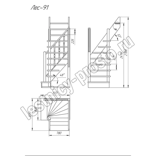 Деревянная межэтажная лестница ЛЕС-91 2475-2700 проем 1220-800, Сосна