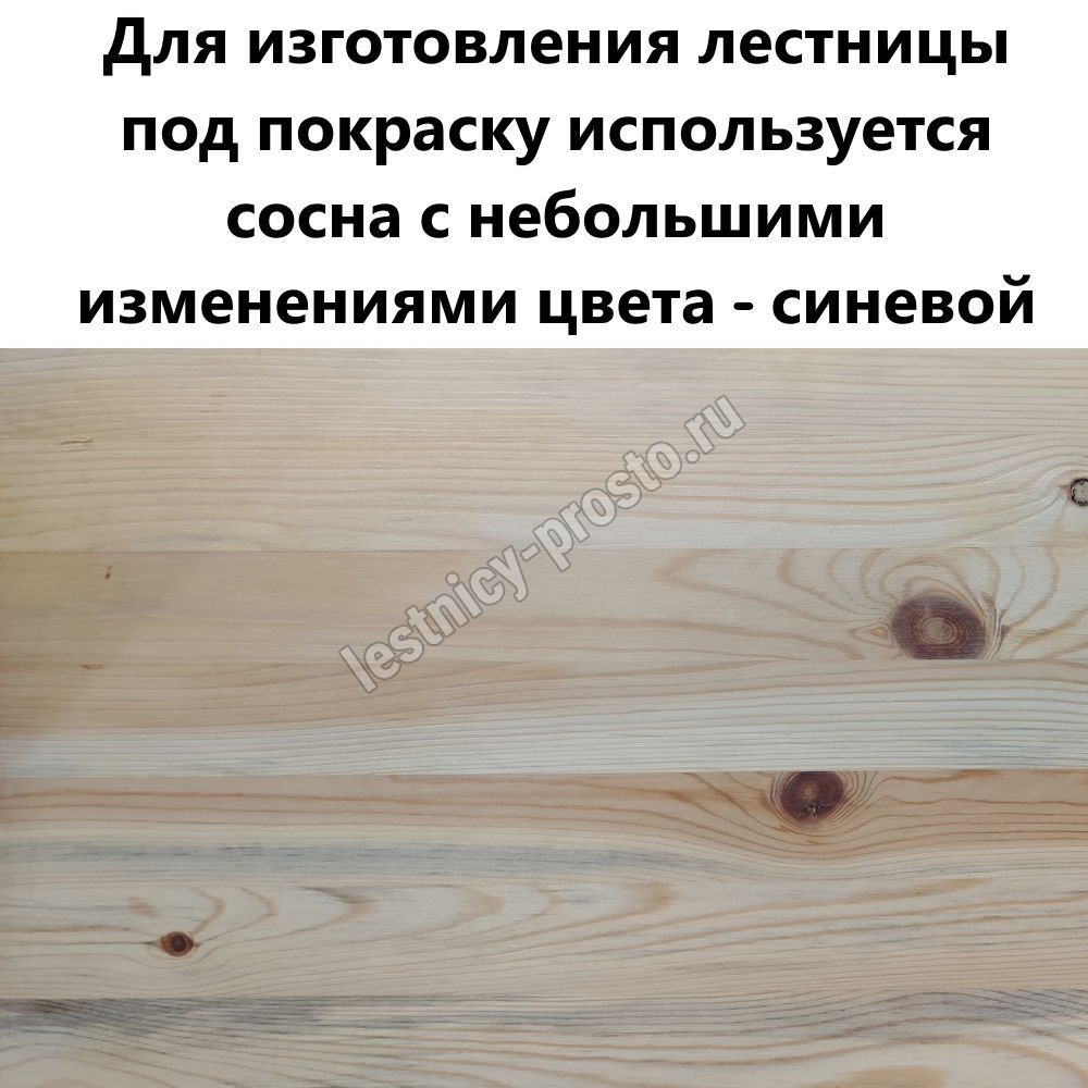 Обратите внимание! Данный вариант лестницы изготовлен из сосны эконом-класса, которая имеет заметные области синевы - это никак не отражается на прочности и надёжности лестницы, но может быть заметно при прозрачных покрытиях и покраске лестницы в светлые тона.