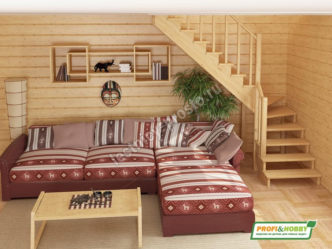 Ступени и поручень лестницы изготовлены из ясеня, остальные элементы из сосны.