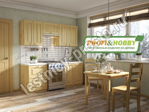 Небольшой кухонный гарнитур из 100% массива сосны шириной всего 2 и высотой 2,32 метра (верхние шкафы 90 см). Один из самых распространенных проектов кухни, который подойдёт для небольшой квартиры, загородного дома, гостиницы или хостела. Цвет на выбор - более 20 вариантов (при заказе кухни в нашем интернет магазине просьба указывать название цвета в комментариях).