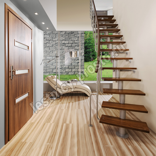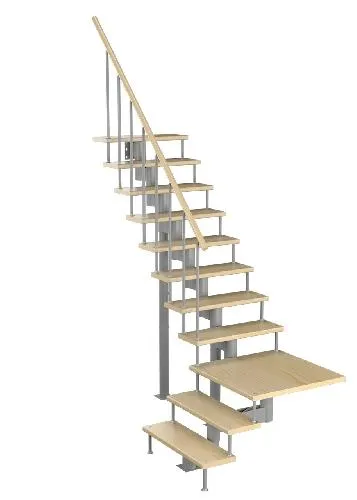 Лестница на стальном модульном каркасе. Высота лестницы регулируется при сборке засчет регулировки высоты шага. Ступени покрыты защитным лаком. Ограждение из стали с пластиковым поручнем. В комплект входят перила с вертикальными стойками и горизонтальными перегородками. Изделие поставляется с шурупами (кроме потолочных и напольных анкеров), инструкциями по монтажу и эксплуатации и гарантией. Внимание! Для этой лестницы необходимо крепление к стене.