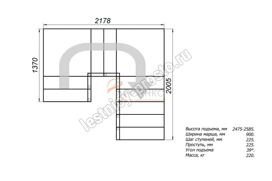 Модульная лестница Комфорт 225 2475-2585, Серый, Сосна, Нержавеющая сталь