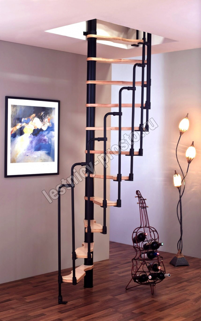 Компактная надёжная лестница. Ступени толщиной 30 мм, изготовлены из массива берёзы по технологии Multiplex, лакированные. Все металлические части оцинкованы горячим способом и покрыты порошковой краской - черного цвета; Лестница имеет надёжную несущую стальную конструкцию.